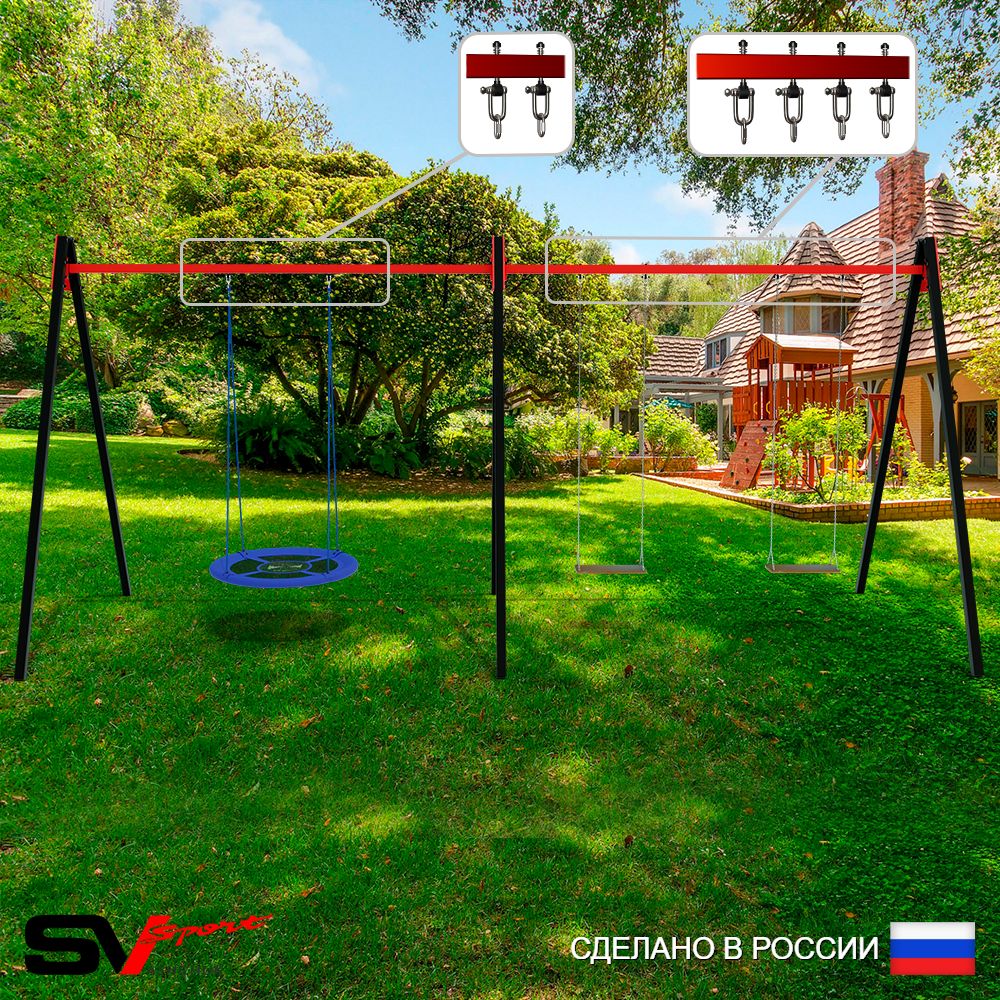 КОМПЛЕКТАЦИЯ: Каркас УК Sv Sport Maxi 6.0м, Качели - гнездо Оксф. 100см, Качели деревянные на цепях Sv Sport 2шт, Подвесы для качелей на втулке Sv Sport 3 компл.
