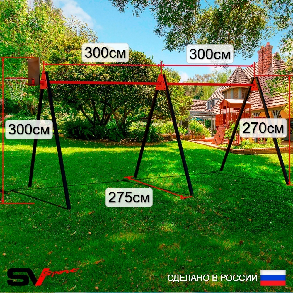 КОМПЛЕКТАЦИЯ: Каркас УК Sv Sport Maxi 6.0м, Щит баскетбольный Sv Sport c кронштейном к УК Sv Sport Maхi, Качели - гнездо Оксф. 100см 2шт, Качели пластиковые со спинкой на цепях 2шт, Подвесы для качелей на втулке Sv Sport 4 компл.