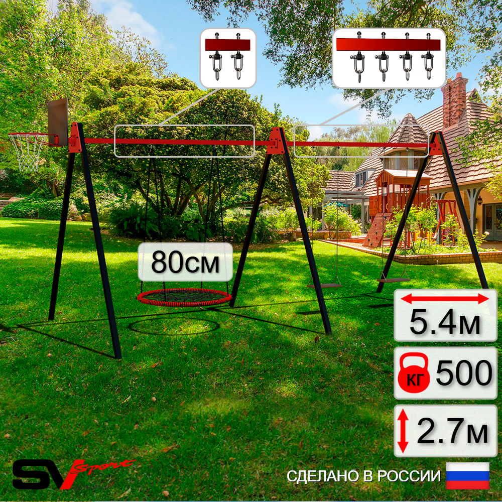КОМПЛЕКТАЦИЯ: Каркас УК Sv Sport Maxi 5.4м, Щит баскетбольный Sv Sport c кронштейном к УК Sv Sport Maхi, Качели - гнездо 80см, Качели деревянные на цепях Sv Sport 2шт, Подвесы для качелей на втулке Sv Sport 3 компл.
