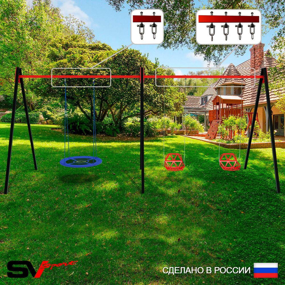 КОМПЛЕКТАЦИЯ: Каркас УК Sv Sport Maxi 5.4м, Качели - гнездо Оксф. 100см, Качели пластиковые со спинкой на цепях 2шт, Подвесы для качелей на втулке Sv Sport 3 компл.