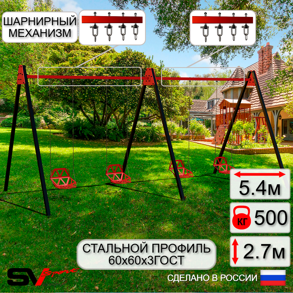 КОМПЛЕКТАЦИЯ: Каркас УК Sv Sport Maxi 5.4м, Качели пластиковые со спинкой на цепях 4шт, Подвесы для качелей на втулке Sv Sport 4 компл.