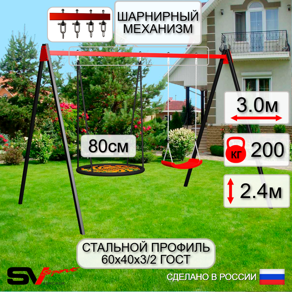 КОМПЛЕКТАЦИЯ: Каркас УК Sv Sport 3.0м, Качели - гнездо 80см, Качели пластиковые "Лодочка", Подвесы для качелей на втулке Sv Sport 2 компл.