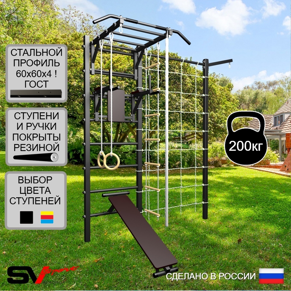 КОМПЛЕКТАЦИЯ: Уличная шведская стенка Sv Sport, Турник Sv Sport Рукоход к УШС, Брусья Sv Sport к УШС, Скамья для пресса и жима Sv Sport к УШС, Комплект: канат с крепежом, кольца гимнастические деревянные, лестница веревочная, Кронштейн для подвеса боксерского мешка, Сетка к спортивному комплексу, Комплект турник прямой.