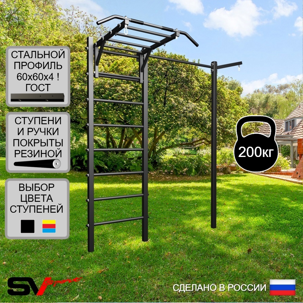 Уличная шведская стенка Sv Sport с комплектом турник прямой  изготовлена из профильной трубы 60 х 60 х 4 мм. Ступени изготовлены из круглой, стальной трубы, покрытой резиной (не скользят, не натирают мозоли, не прокручиваются, не имеют запаха, приятны на ощупь). Окрашена качественной, импортной порошковой краской в 2 этапа, устойчивой к коррозии, истиранию и температурным перепадам. Все торцы, болты, гайки заглушены пластиковыми заглушками. Устанавливаются стойки путем бетонировки на глубину не менее 600 мм.