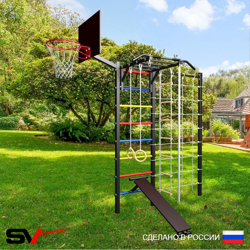 КОМПЛЕКТАЦИЯ: Уличная шведская стенка Sv Sport, Турник Sv Sport Рукоход к УШС, Скамья для пресса и жима Sv Sport к УШС, Комплект: канат с крепежом, кольца гимнастические деревянные, лестница веревочная, Щит баскетбольный Sv Sport c кронштейном к УШС Sv Sport, Сетка к спортивному комплексу, Комплект турник прямой.