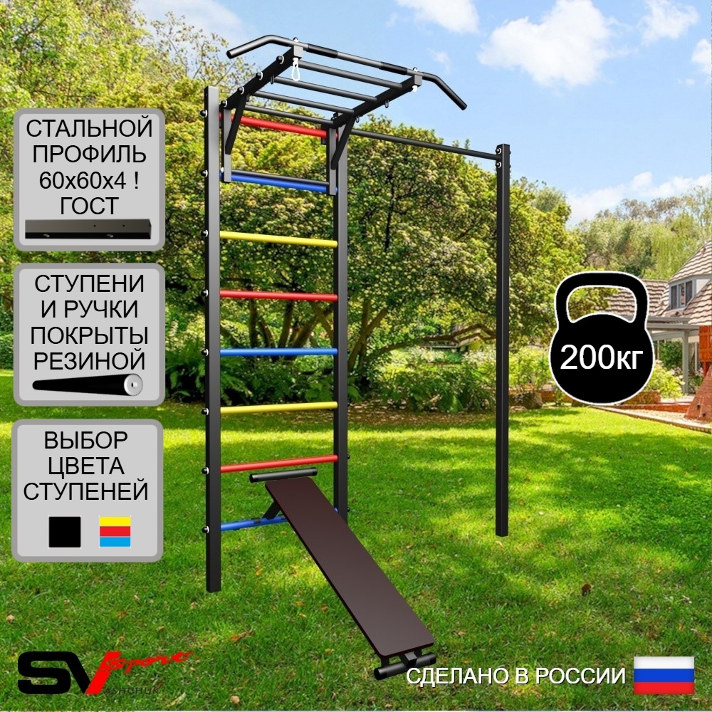 КОМПЛЕКТАЦИЯ: Уличная шведская стенка Sv Sport, Турник Sv Sport Рукоход к УШС, Скамья для пресса и жима Sv Sport к УШС, Комплект турник прямой.