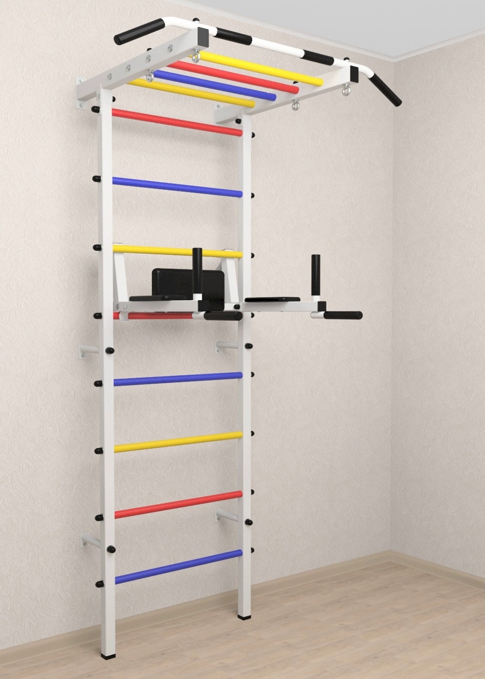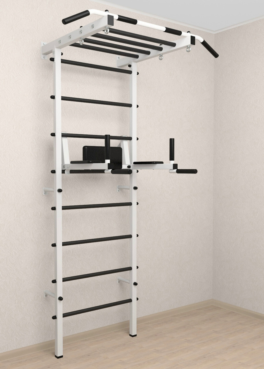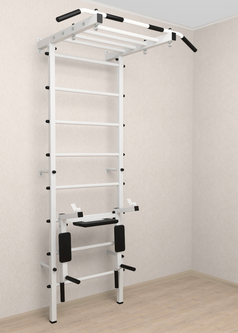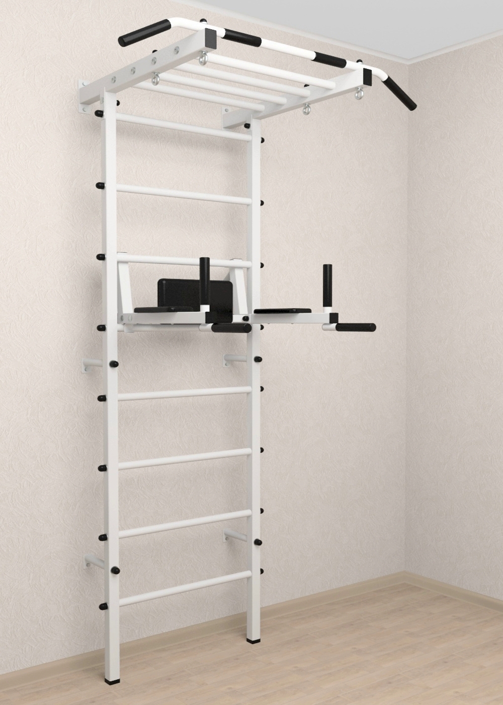 Основные характеристики: Максимально допустимая нагрузка 200 кг; Вылет от комплекса в положении брусья 71 см; Вылет от комплекса в положении стойки под штангу 26 см; Ширина креплений брусьев 54 см; Полимерная покраска; Резиновые ручки длина 16 см; Цвет покраски: белый; Гарантия 24 месяца.