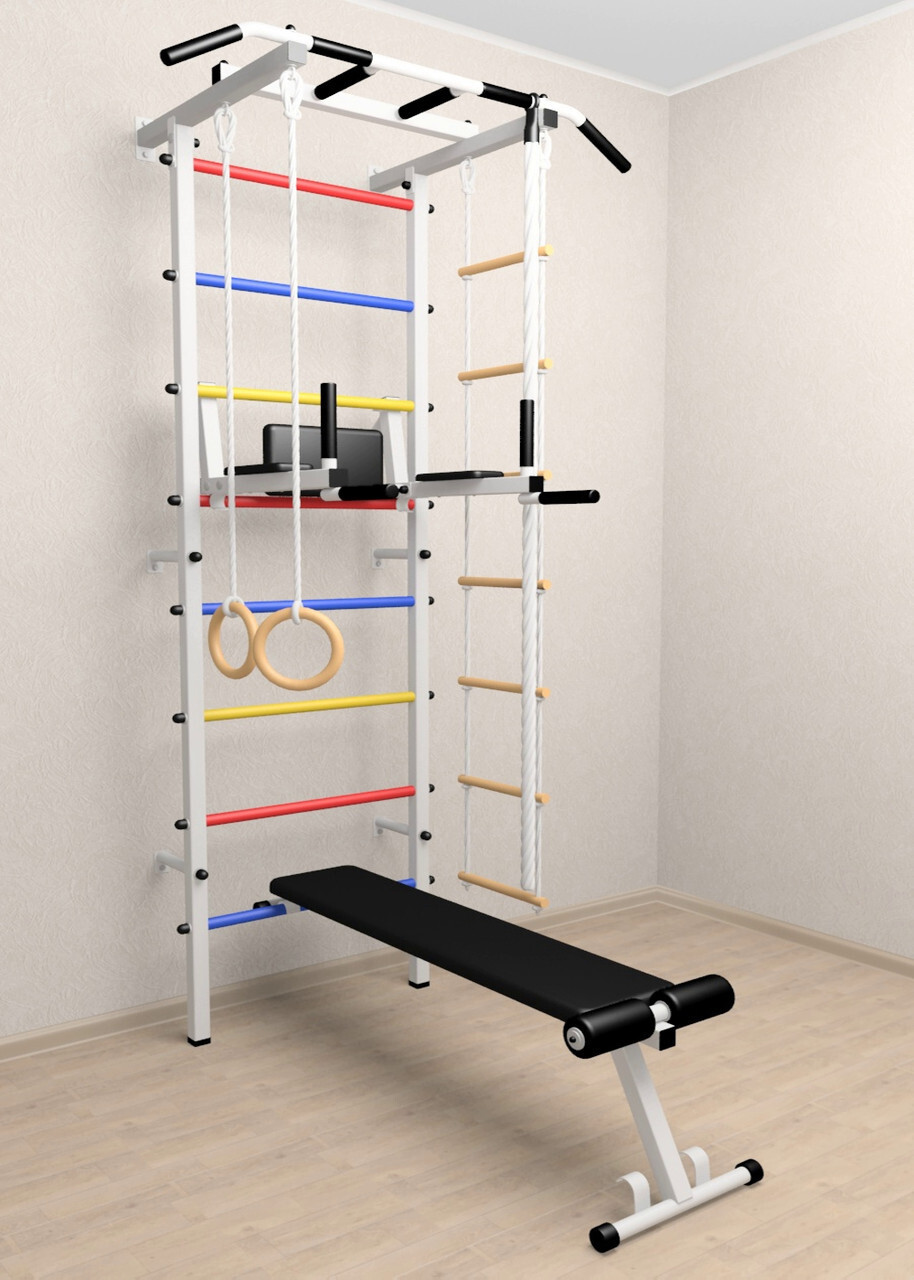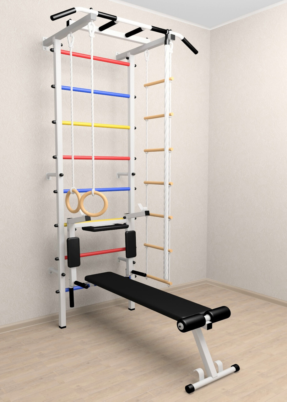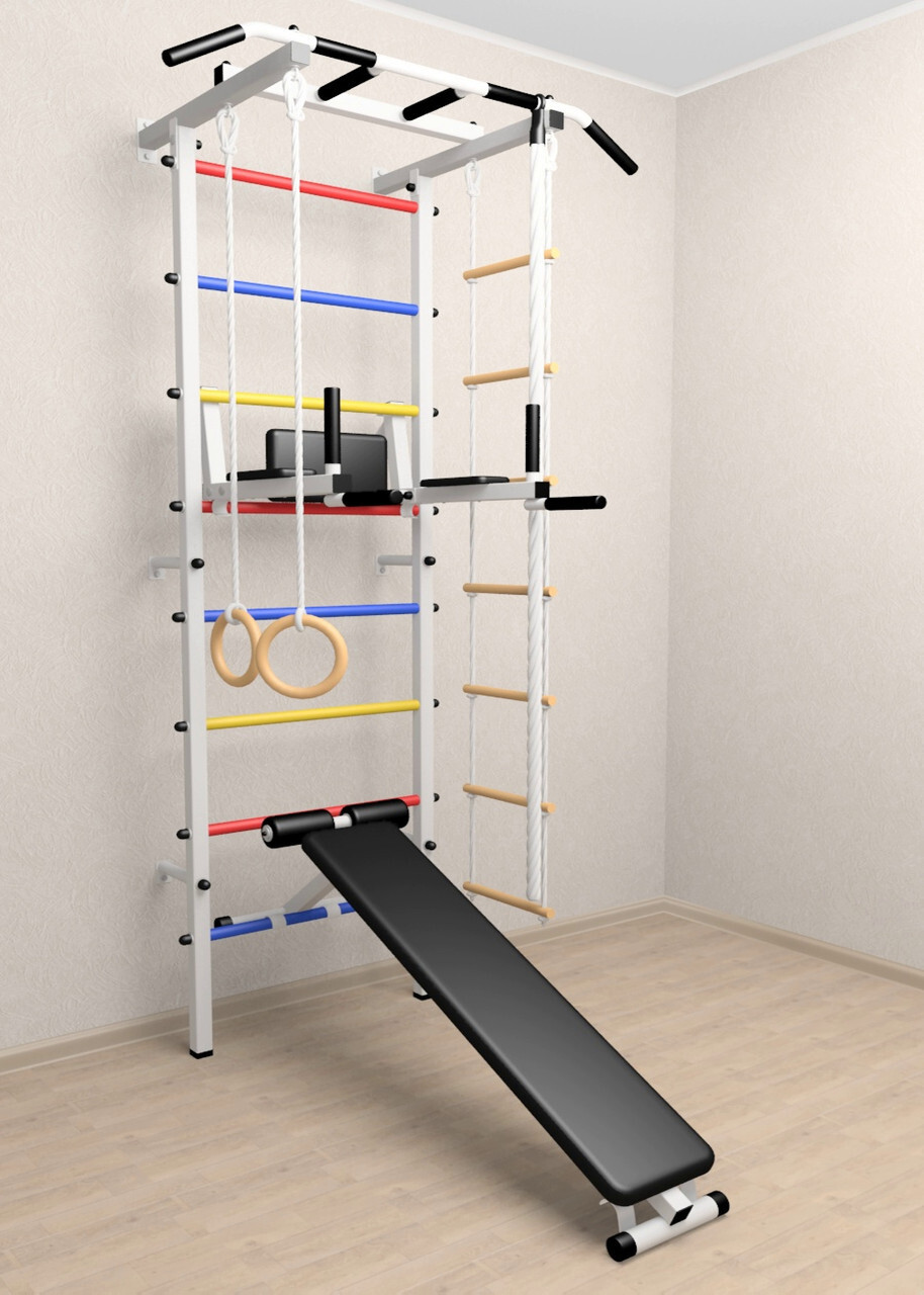 КОМПЛЕКТАЦИЯ: Шведская стенка Sv Pro, Турник Sv Pro к ШС, Брусья\стойка под штангу Sv Pro к ШС, Скамья для пресса и жима Sv Sport к ШС, Kанат, Kольца деревянные, Лестница веревочная.