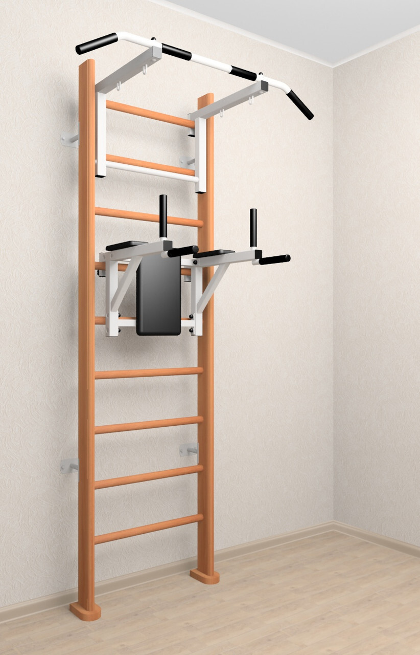 Основные характеристики: Максимально допустимая нагрузка 200 кг; Вылет брусьев от шведской стенки 68 см; Ширина креплений брусьев 54 см; Полимерная покраска; Резиновые ручки длина 16 см; Цвет покраски: белый; Гарантия 24 месяца.