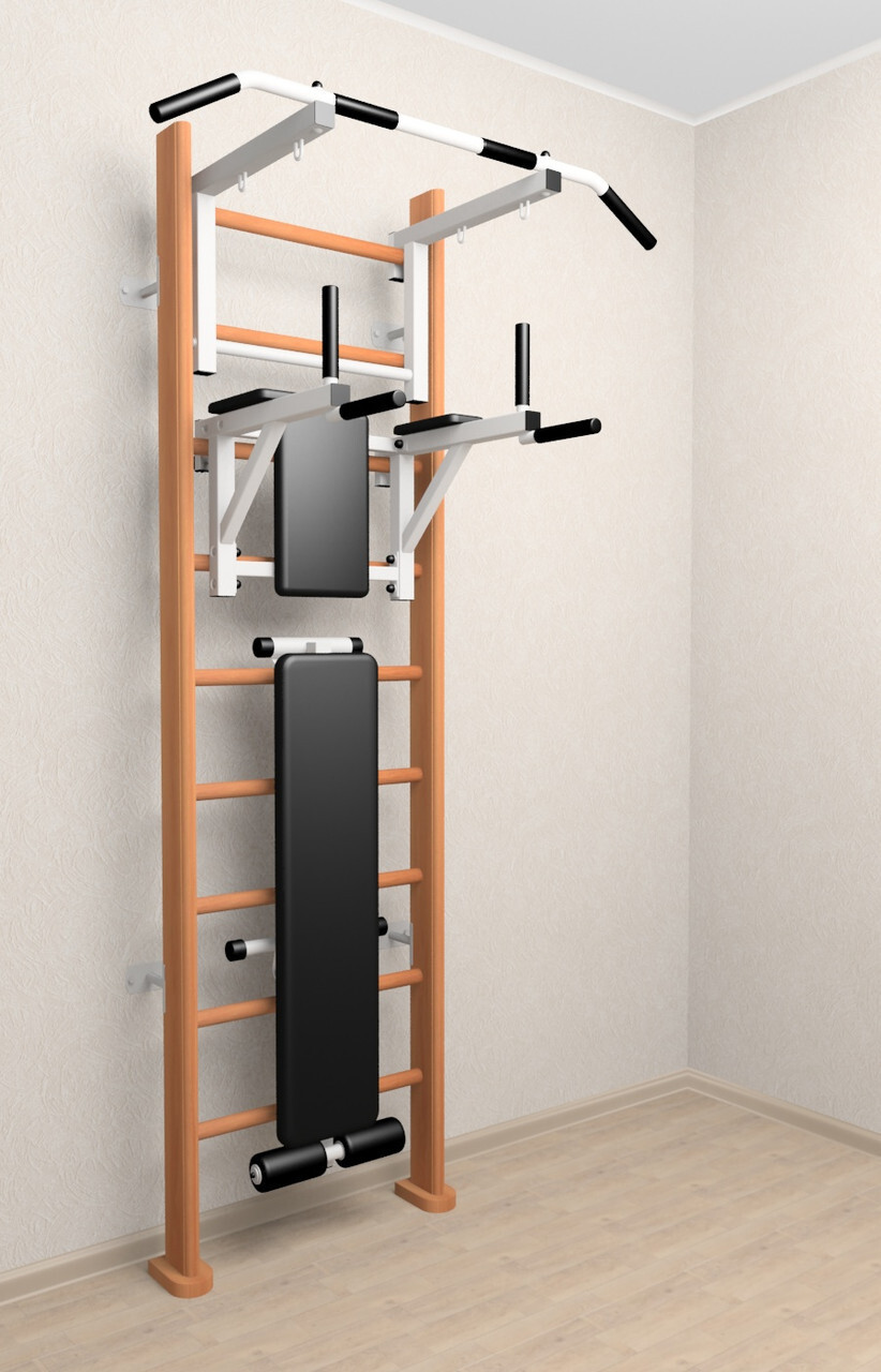 Основные характеристики: Максимально допустимая нагрузка 200 кг; Вылет брусьев от шведской стенки 68 см; Ширина креплений брусьев 54 см; Полимерная покраска; Резиновые ручки длина 16 см; Цвет покраски: белый; Гарантия 24 месяца.