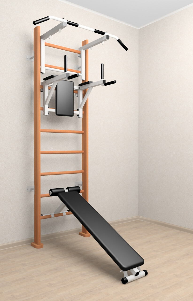 Силовая скамья. Разместив универсальную скамейку горизонтально на шведской стенке можно выполнять различные упражнения с гантелями, жим лежа, поднимание ног.