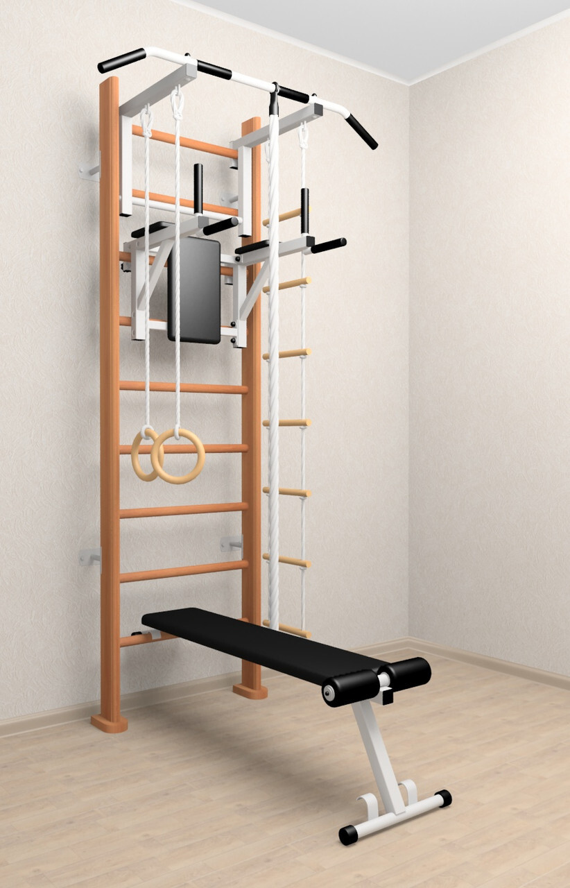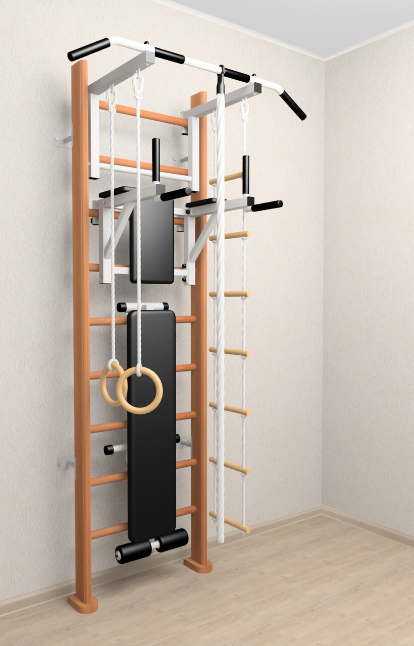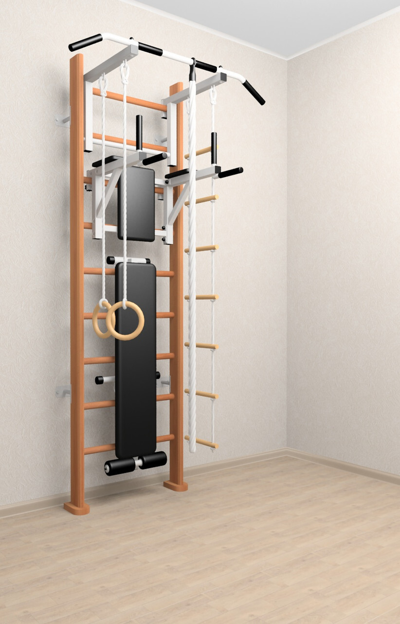 КОМПЛЕКТАЦИЯ: Деревянная шведская стенка Sv Sport (Орех), Турник Sv Sport стандарт к ШС, Брусья Sv Sport к ШС, Скамья для пресса и жима Sv Sport к ШС, Kанат, Kольца деревянные, Лестница веревочная.