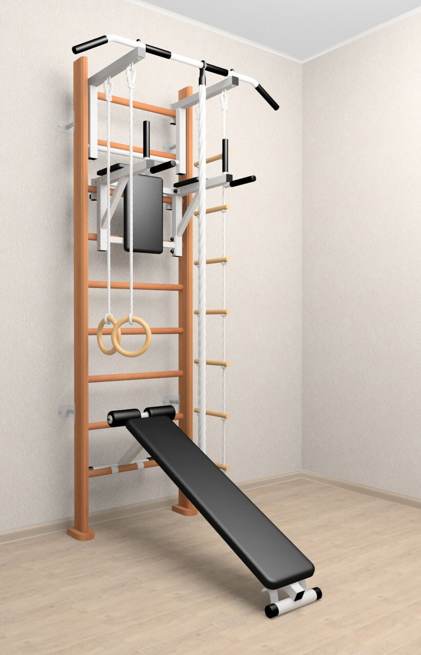 Силовая скамья. Разместив универсальную скамейку горизонтально на шведской стенке можно выполнять различные упражнения с гантелями, жим лежа, поднимание ног.