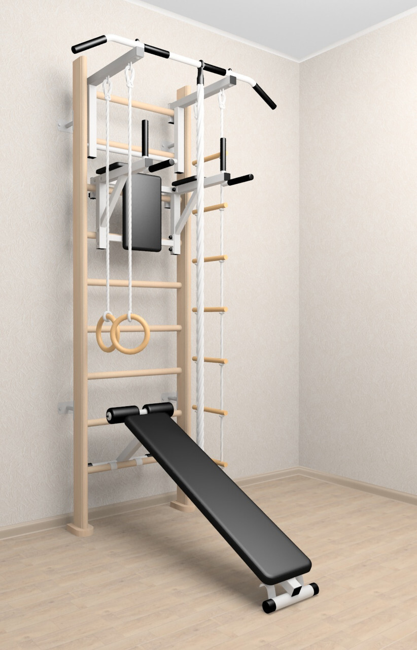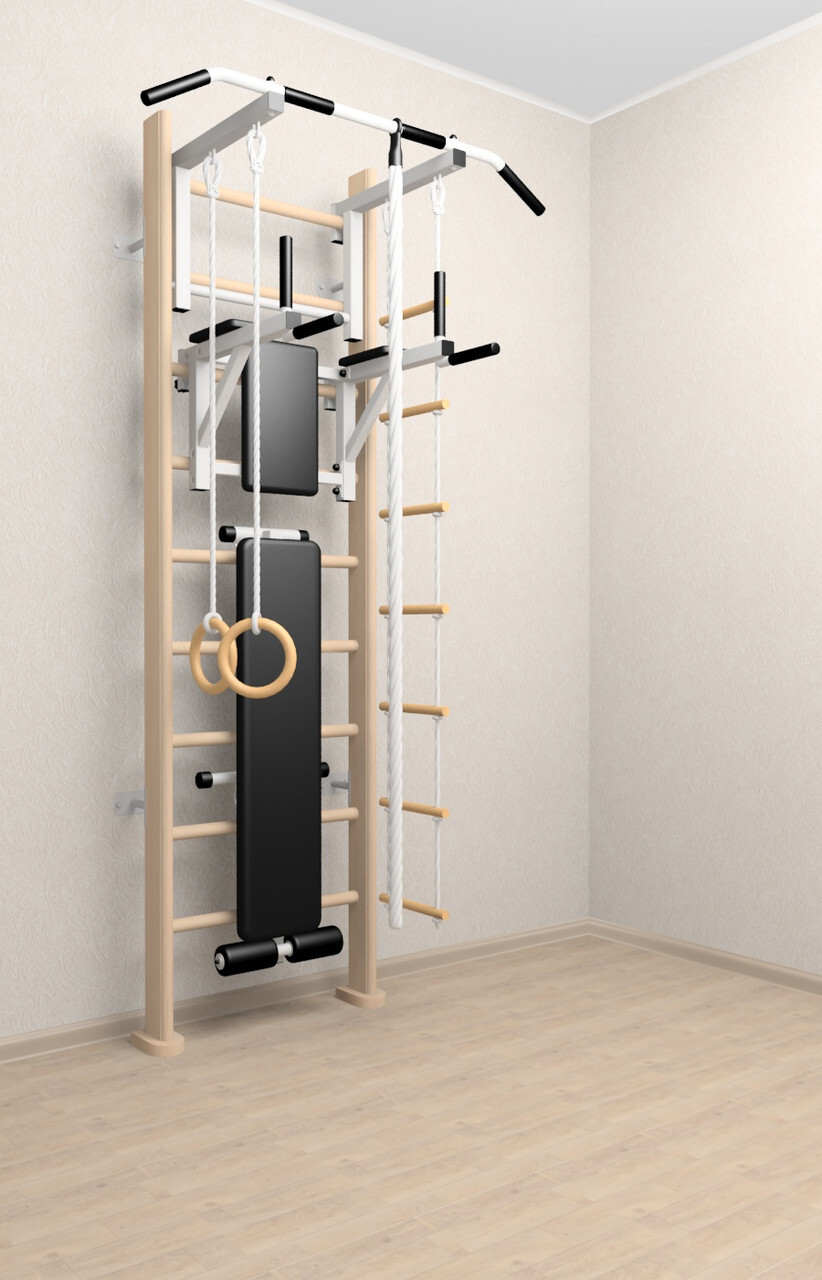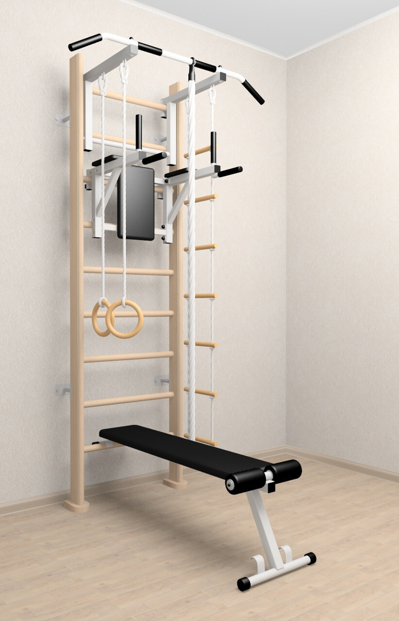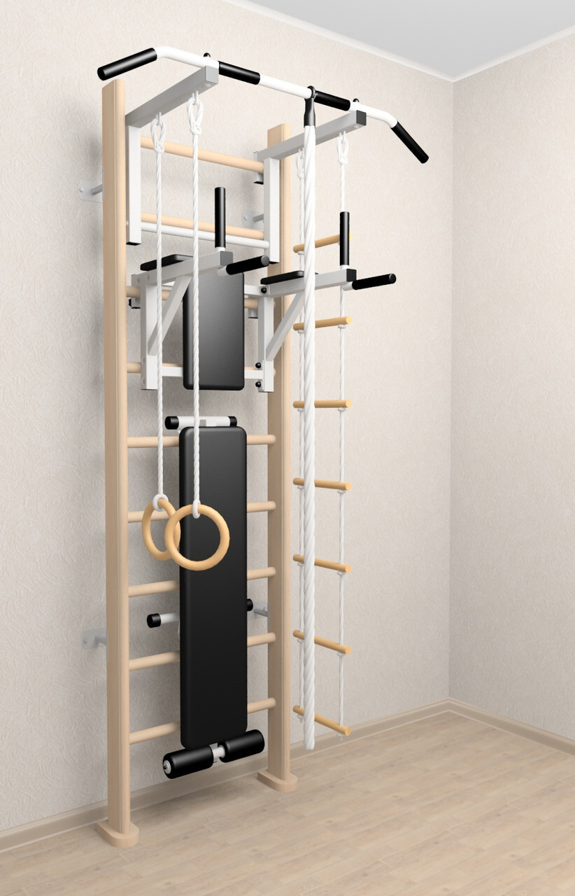 КОМПЛЕКТАЦИЯ: Деревянная шведская стенка Sv Sport (Светлый), Турник Sv Sport стандарт к ШС, Брусья Sv Sport к ШС, Скамья для пресса и жима Sv Sport к ШС, Kанат, Kольца деревянные, Лестница веревочная.