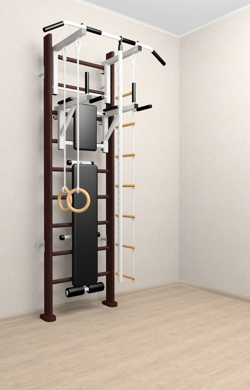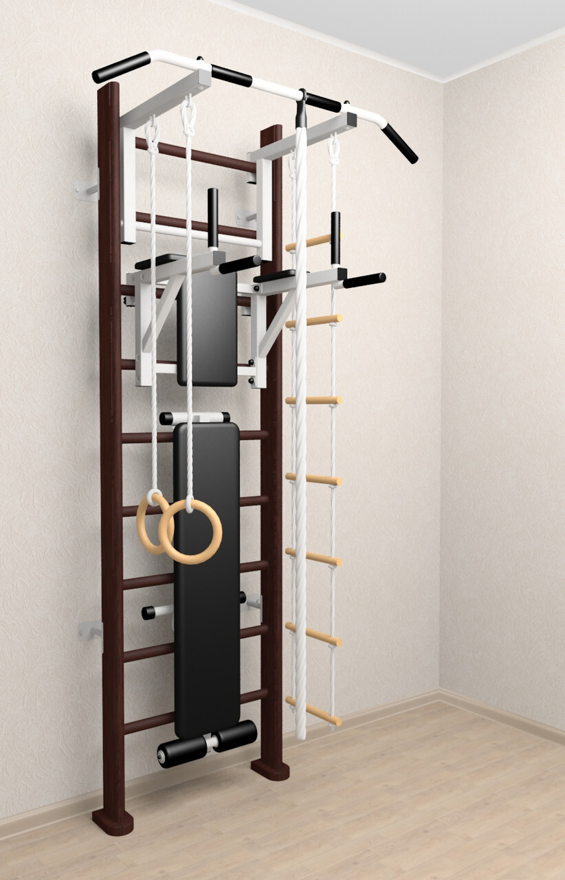 КОМПЛЕКТАЦИЯ: Деревянная шведская стенка Sv Sport (Венге), Турник Sv Sport стандарт к ШС, Брусья Sv Sport к ШС, Скамья для пресса и жима Sv Sport к ШС, Kанат, Kольца деревянные, Лестница веревочная.