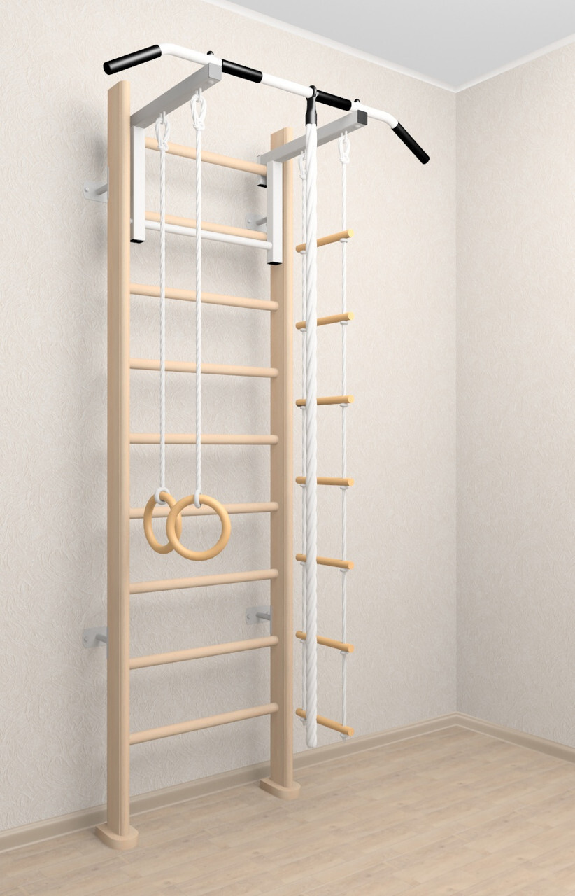 КОМПЛЕКТАЦИЯ: Деревянная шведская стенка Sv Sport (Светлый), Турник Sv Sport стандарт к ШС, Брусья Sv Sport к ШС, Скамья для пресса и жима Sv Sport к ШС, Kанат, Kольца деревянные, Лестница веревочная.