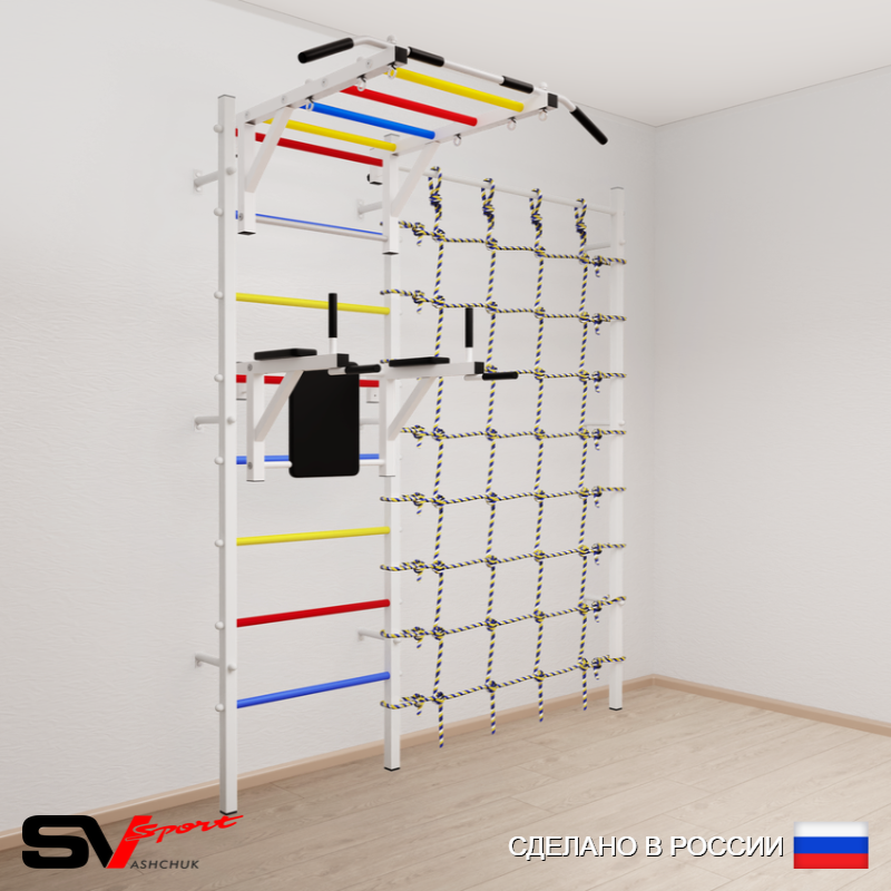 КОМПЛЕКТАЦИЯ: Шведская стенка Sv Sport (профиль вертикальных стоек 40 х 40 х 2 мм), Турник Sv Sport рукоход к ШС, Брусья Sv Sport к ШС, Канатный лаз.