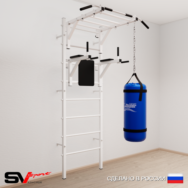 КОМПЛЕКТАЦИЯ: Шведская стенка Sv Sport (профиль вертикальных стоек 40 х 40 х 2 мм), Турник Sv Sport рукоход к ШС, Брусья Sv Sport к ШС, Цепь удлинитель 90см, Мешок боксерский 15кг.