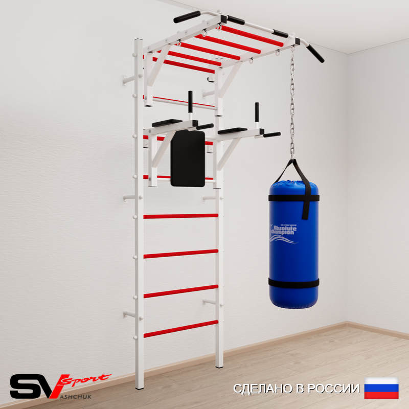 КОМПЛЕКТАЦИЯ: Шведская стенка Sv Sport (профиль вертикальных стоек 40 х 40 х 2 мм), Турник Sv Sport рукоход к ШС, Брусья Sv Sport к ШС, Цепь удлинитель 90см, Мешок боксерский 22кг.