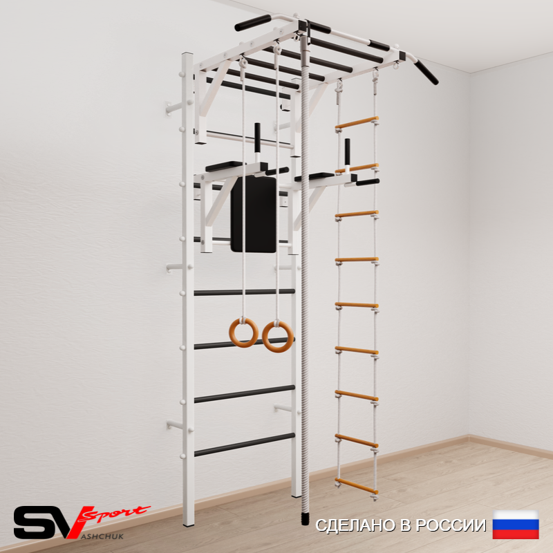 КОМПЛЕКТАЦИЯ: Шведская стенка Sv Sport (профиль вертикальных стоек 40 х 40 х 2 мм), Турник Sv Sport рукоход к ШС, Брусья Sv Sport к ШС, Kанат, Kольца деревянные, Лестница веревочная.