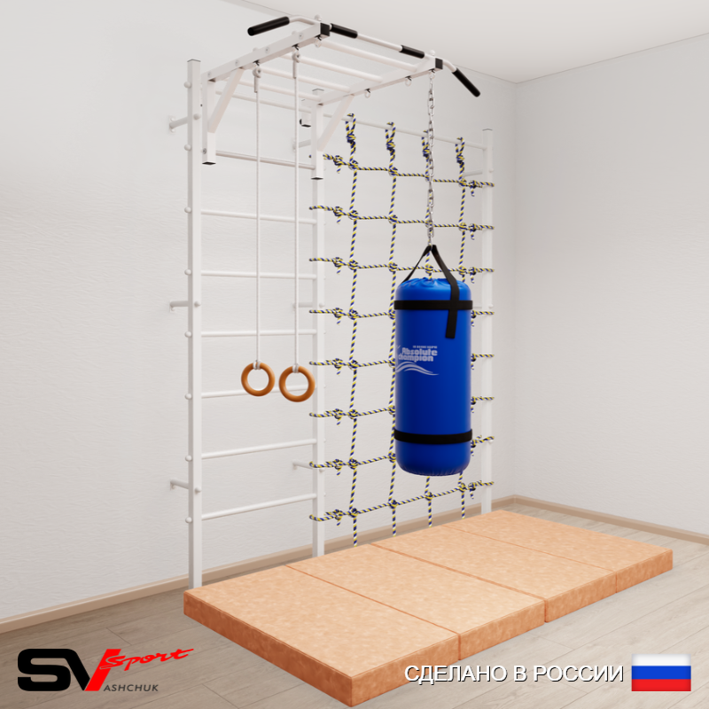 КОМПЛЕКТАЦИЯ: Шведская стенка Sv Sport (профиль вертикальных стоек 40 х 40 х 2 мм), Турник Sv Sport рукоход к ШС, Kольца деревянные, Цепь удлинитель 90см, Мешок боксерский 30кг, Спортивный мат 100 х 200 х 10 см складной, Канатный лаз.