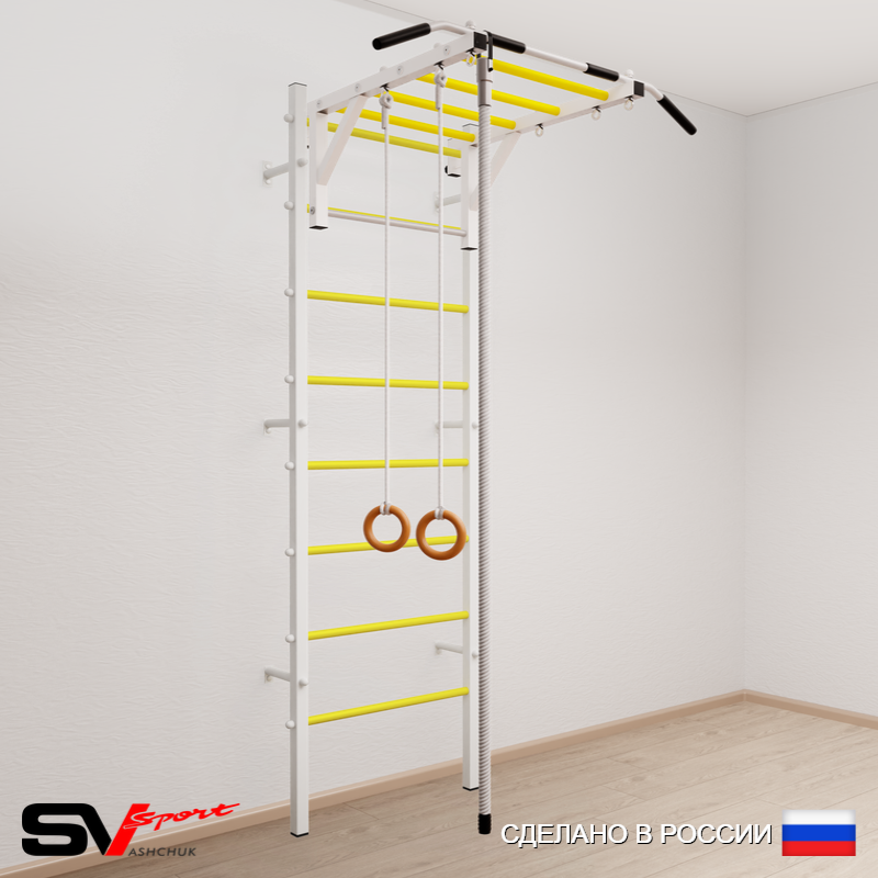 КОМПЛЕКТАЦИЯ: Шведская стенка Sv Sport (профиль вертикальных стоек 40 х 40 х 2 мм), Турник Sv Sport рукоход к ШС, Kанат, Kольца деревянные.