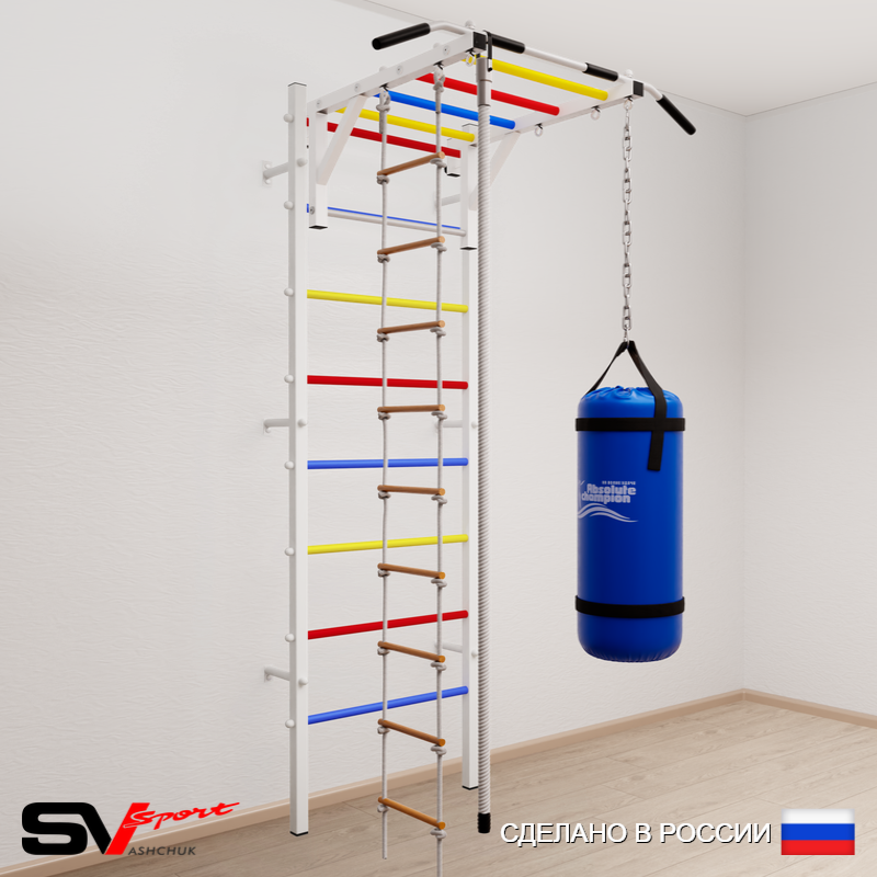 КОМПЛЕКТАЦИЯ: Шведская стенка Sv Sport (профиль вертикальных стоек 40 х 40 х 2 мм), Турник Sv Sport рукоход к ШС, Kанат, Лестница веревочная, Цепь удлинитель 90см, Мешок боксерский 15кг.