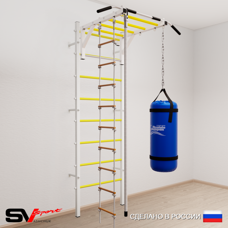 КОМПЛЕКТАЦИЯ: Шведская стенка Sv Sport (профиль вертикальных стоек 40 х 40 х 2 мм), Турник Sv Sport рукоход к ШС, Kанат, Лестница веревочная, Цепь удлинитель 90см, Мешок боксерский 22кг.