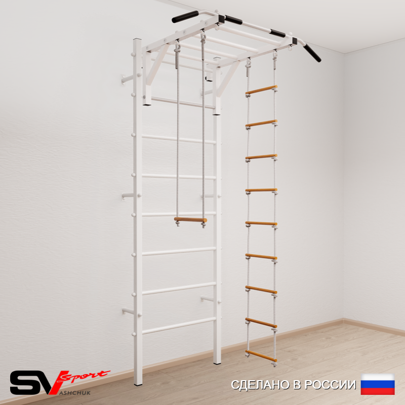 КОМПЛЕКТАЦИЯ: Шведская стенка Sv Sport (профиль вертикальных стоек 40 х 40 х 2 мм), Турник Sv Sport рукоход к ШС, Трапеция, Лестница веревочная.
