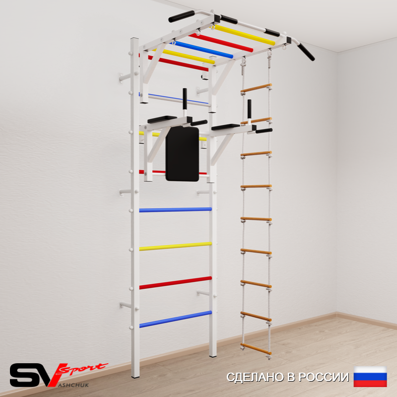 КОМПЛЕКТАЦИЯ: Шведская стенка Sv Sport (профиль вертикальных стоек 40 х 40 х 2 мм), Турник Sv Sport рукоход к ШС, Брусья Sv Sport к ШС, Лестница веревочная.