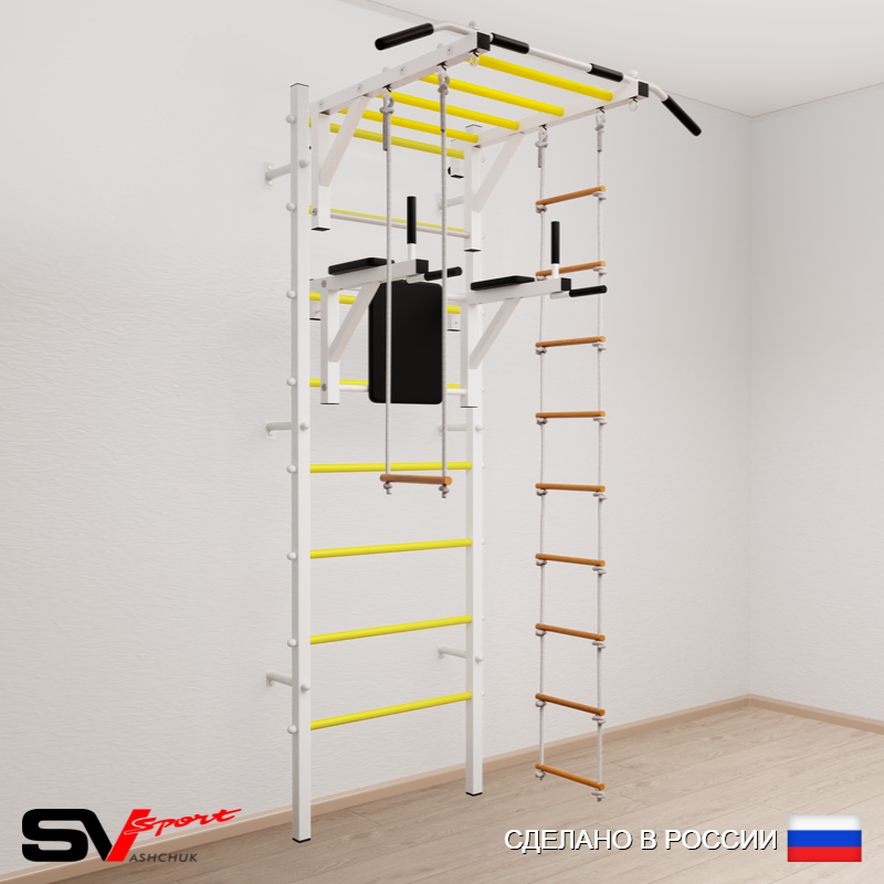КОМПЛЕКТАЦИЯ: Шведская стенка Sv Sport (профиль вертикальных стоек 40 х 40 х 2 мм), Турник Sv Sport рукоход к ШС, Брусья Sv Sport к ШС, Трапеция, Лестница веревочная.