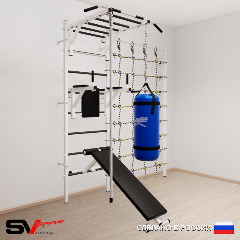 КОМПЛЕКТАЦИЯ: Шведская стенка Sv Sport (профиль вертикальных стоек 40 х 40 х 2 мм), Турник Sv Sport рукоход к ШС, Брусья Sv Sport к ШС, Скамья для пресса и жима Sv Sport к ШС, Kанат, Цепь удлинитель 90см, Мешок боксерский 30кг, Канатный лаз.