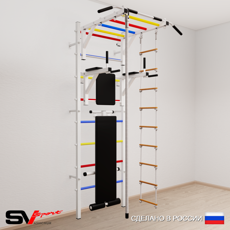 КОМПЛЕКТАЦИЯ: Шведская стенка Sv Sport (профиль вертикальных стоек 40 х 40 х 2 мм), Турник Sv Sport рукоход к ШС, Брусья Sv Sport к ШС, Скамья для пресса и жима Sv Sport к ШС, Kанат, Лестница веревочная.