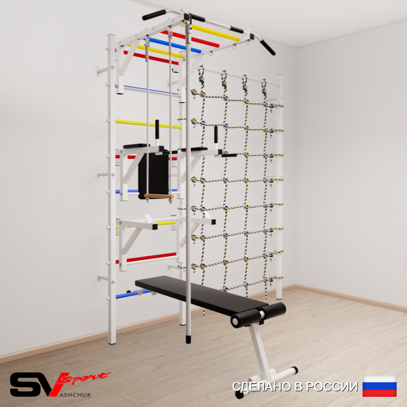 КОМПЛЕКТАЦИЯ: Шведская стенка Sv Sport (профиль вертикальных стоек 40 х 40 х 2 мм), Турник Sv Sport рукоход к ШС, Брусья Sv Sport к ШС, Стойка под штангу Sv Sport к ШС, Скамья для пресса и жима Sv Sport к ШС, Kанат, Трапеция, Канатный лаз.