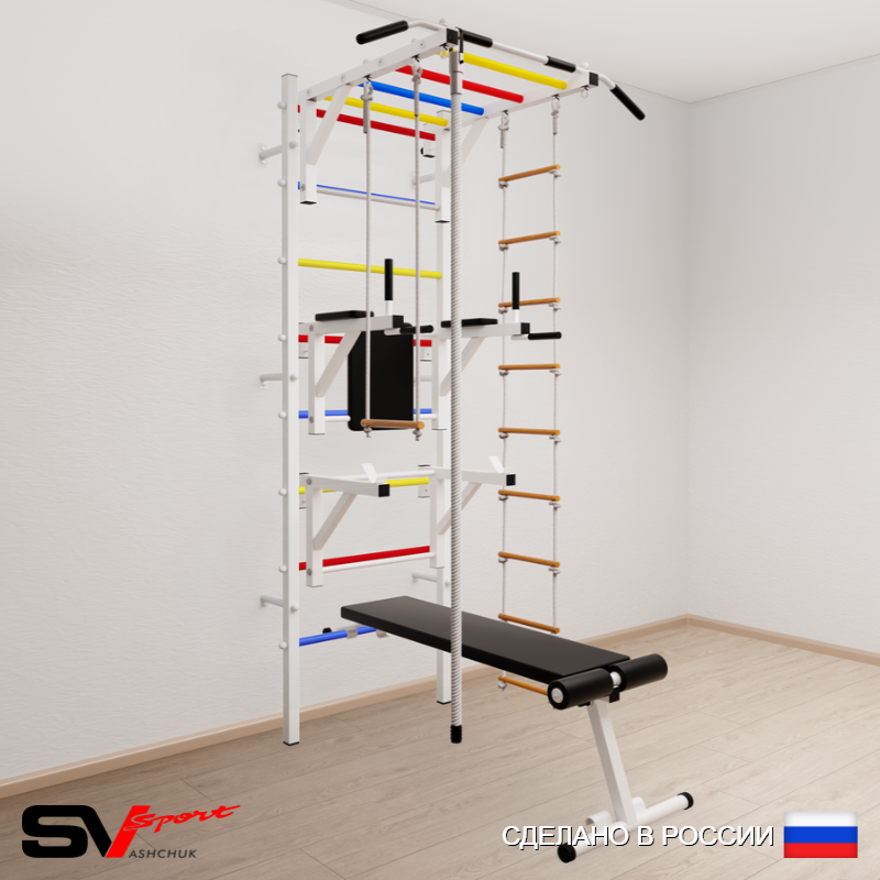 КОМПЛЕКТАЦИЯ: Шведская стенка Sv Sport (профиль вертикальных стоек 40 х 40 х 2 мм), Турник Sv Sport рукоход к ШС, Брусья Sv Sport к ШС, Стойка под штангу Sv Sport к ШС, Скамья для пресса и жима Sv Sport к ШС, Kанат, Трапеция, Лестница веревочная.