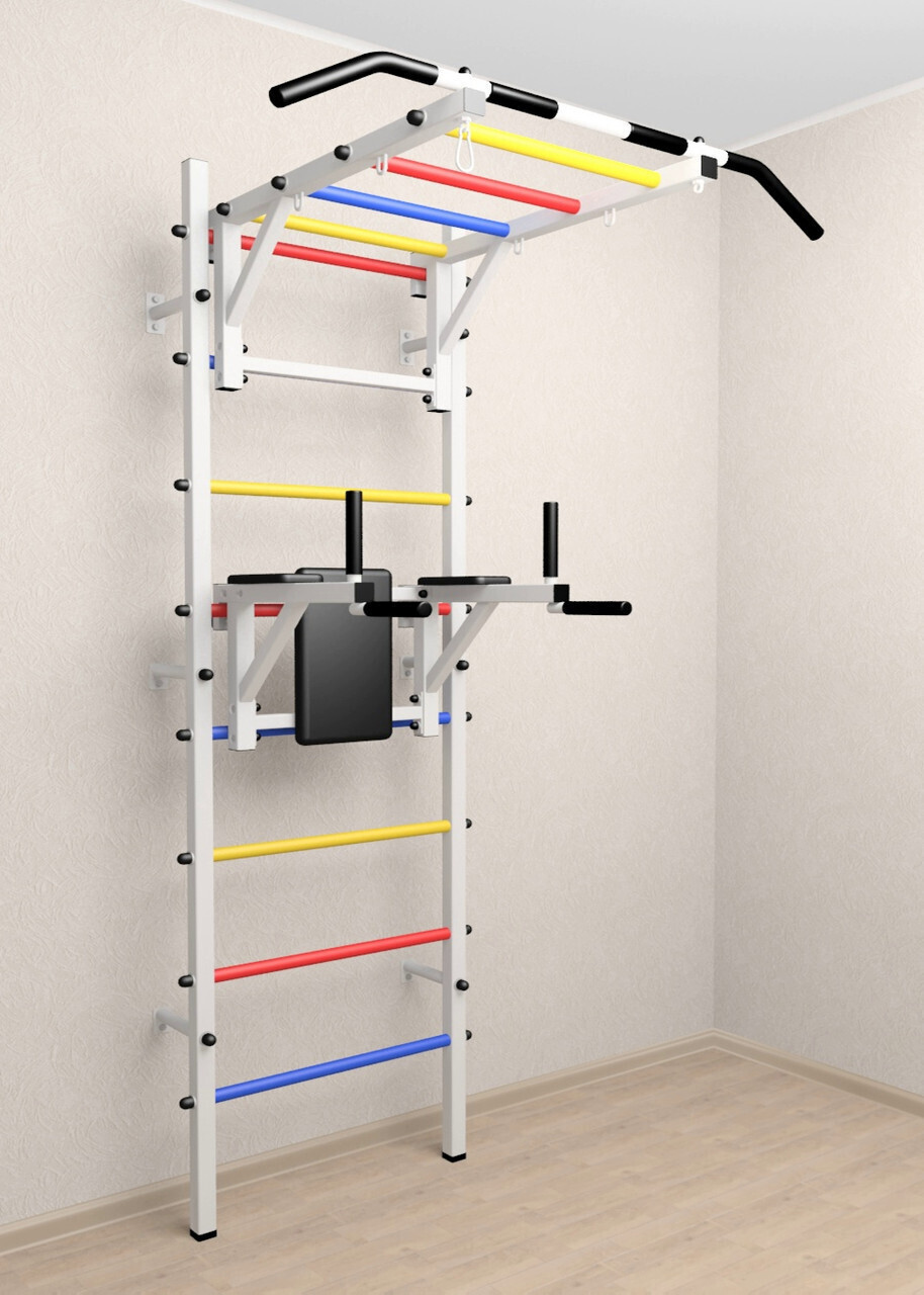 Основные характеристики: Максимально допустимая нагрузка 200 кг; Вылет брусьев от шведской стенки 68 см; Ширина креплений брусьев 54 см; Полимерная покраска; Резиновые ручки длина 16 см; Цвет покраски: белый; Гарантия 24 месяца.