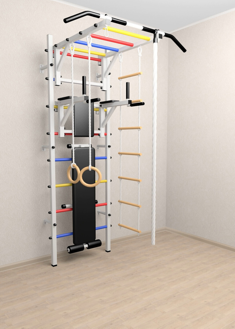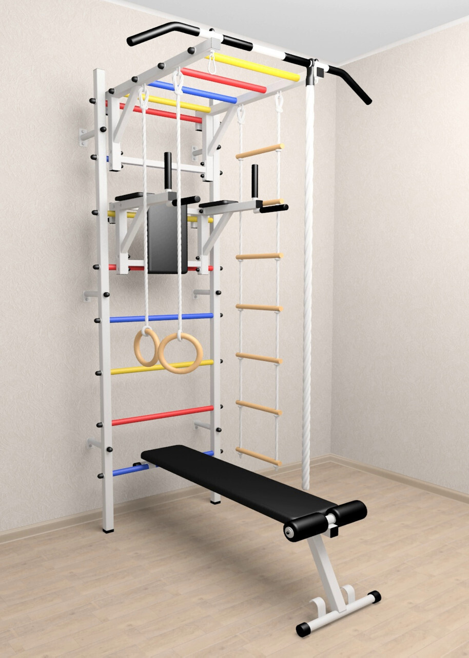 КОМПЛЕКТАЦИЯ: Шведская стенка Sv Sport усиленная (профиль вертикальных стоек 60 х 40 х 2 мм), Турник Sv Sport рукоход к ШС, Брусья Sv Sport к ШС, Скамья для пресса и жима Sv Sport к ШС, Kанат, Kольца деревянные, Лестница веревочная.
