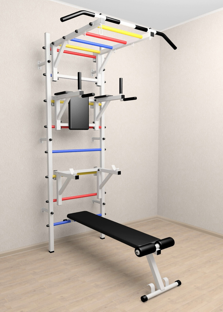 КОМПЛЕКТАЦИЯ: Шведская стенка Sv Sport усиленная (профиль вертикальных стоек 60 х 40 х 2 мм), Турник Sv Sport рукоход к ШС, Брусья Sv Sport к ШС, Стойка под штангу Sv Sport к ШС, Скамья для пресса и жима Sv Sport к ШС.