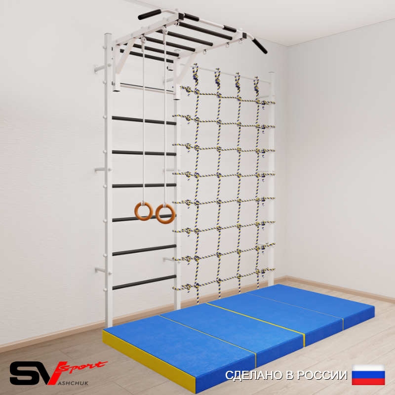 КОМПЛЕКТАЦИЯ: Шведская стенка Sv Sport усиленная (профиль вертикальных стоек 60 х 40 х 2 мм), Турник Sv Sport рукоход к ШС, Kольца деревянные, Спортивный мат 100 х 200 х 10 см складной, Канатный лаз.
