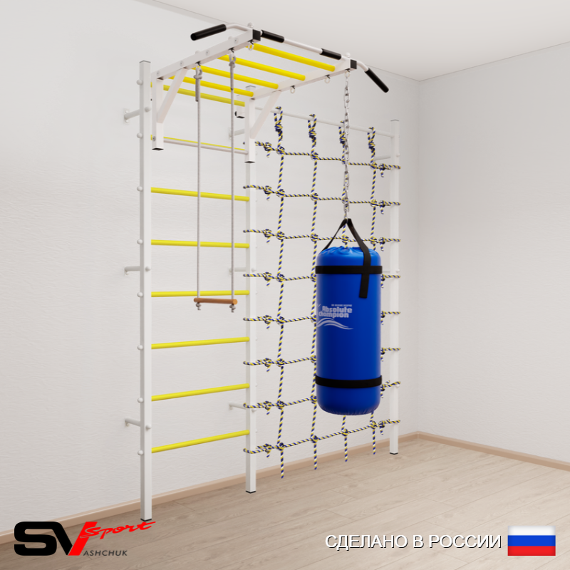 КОМПЛЕКТАЦИЯ: Шведская стенка Sv Sport усиленная (профиль вертикальных стоек 60 х 40 х 2 мм), Турник Sv Sport рукоход к ШС, Трапеция, Цепь удлинитель 90см, Мешок боксерский 15кг, Канатный лаз.