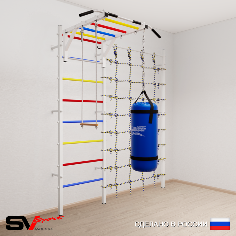 КОМПЛЕКТАЦИЯ: Шведская стенка Sv Sport усиленная (профиль вертикальных стоек 60 х 40 х 2 мм), Турник Sv Sport рукоход к ШС, Трапеция, Цепь удлинитель 90см, Мешок боксерский 22кг, Канатный лаз.
