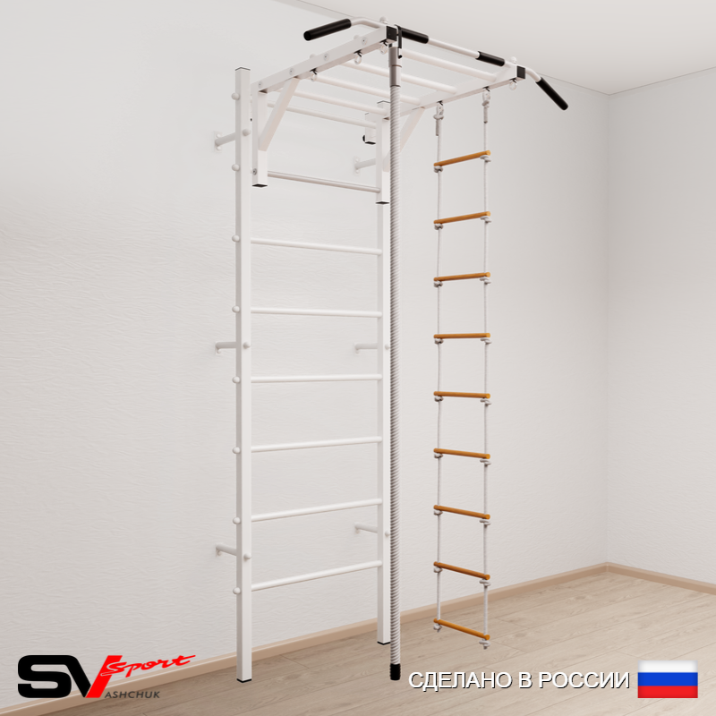 КОМПЛЕКТАЦИЯ: Шведская стенка Sv Sport усиленная (профиль вертикальных стоек 60 х 40 х 2 мм), Турник Sv Sport рукоход к ШС, Kанат, Лестница веревочная.