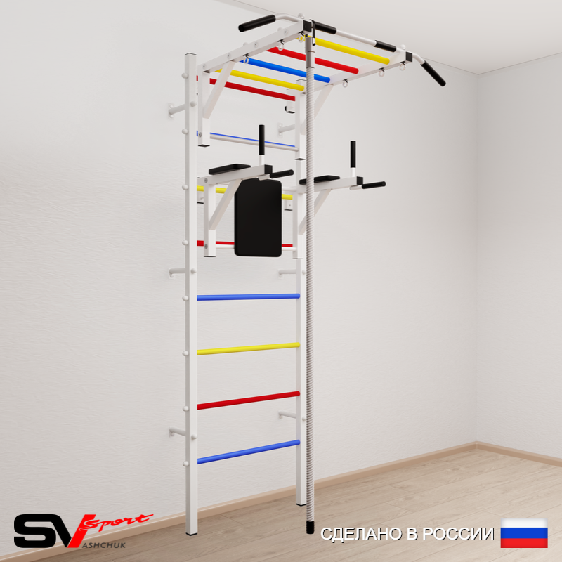 КОМПЛЕКТАЦИЯ: Шведская стенка Sv Sport усиленная (профиль вертикальных стоек 60 х 40 х 2 мм), Турник Sv Sport рукоход к ШС, Брусья Sv Sport к ШС, Kанат.
