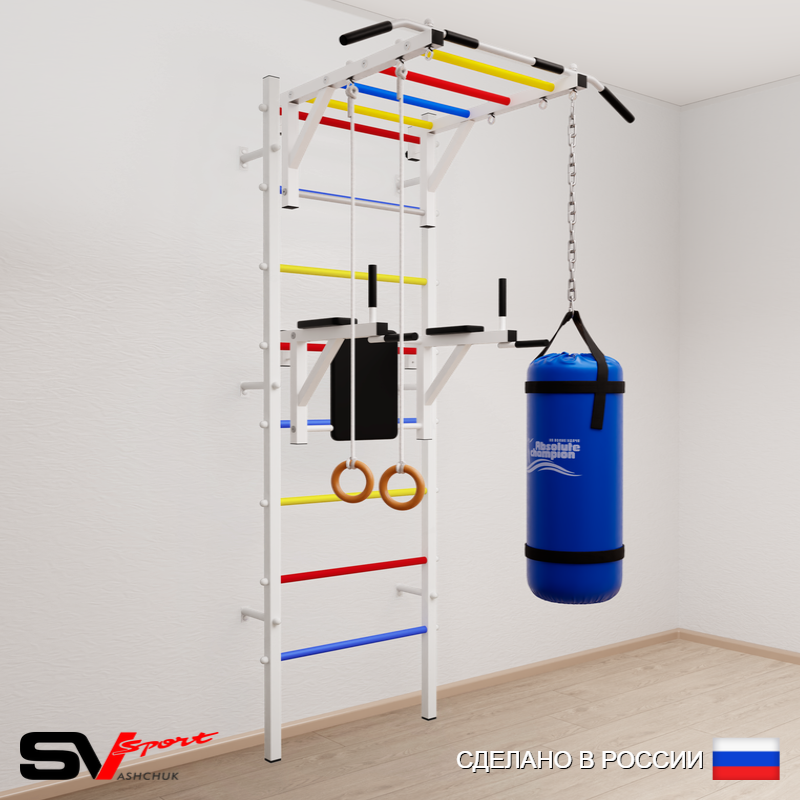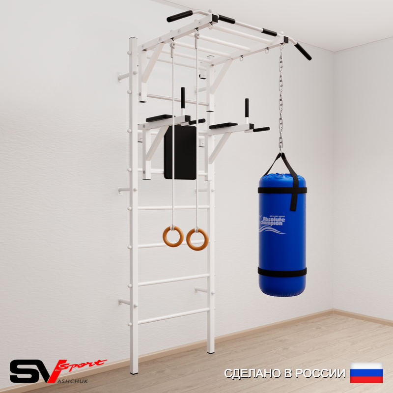 КОМПЛЕКТАЦИЯ: Шведская стенка Sv Sport усиленная (профиль вертикальных стоек 60 х 40 х 2 мм), Турник Sv Sport рукоход к ШС, Брусья Sv Sport к ШС, Kольца деревянные, Цепь удлинитель 90см, Мешок боксерский 15кг.