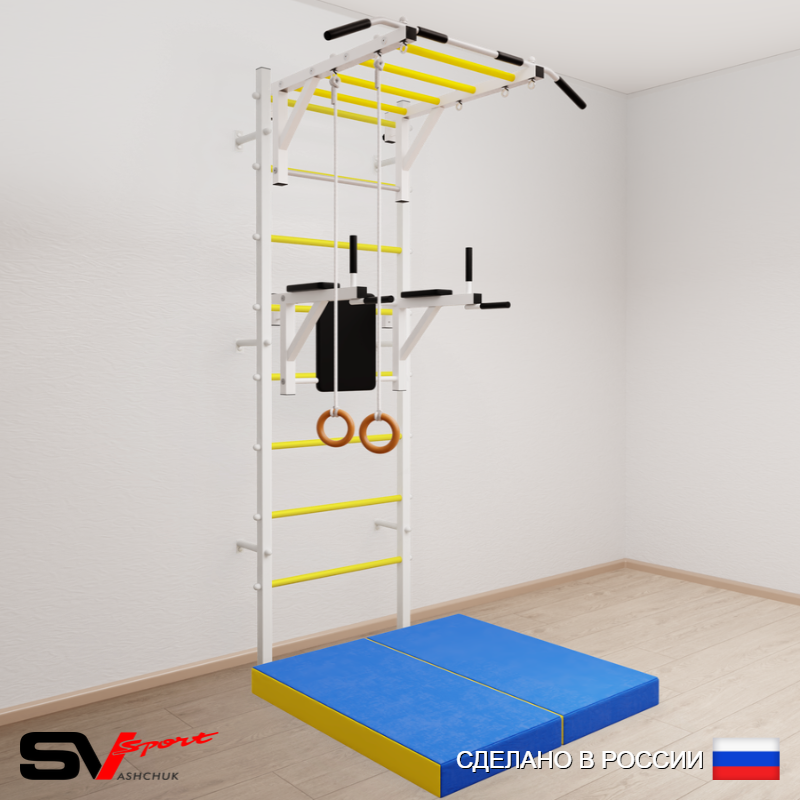 КОМПЛЕКТАЦИЯ: Шведская стенка Sv Sport усиленная (профиль вертикальных стоек 60 х 40 х 2 мм), Турник Sv Sport рукоход к ШС, Брусья Sv Sport к ШС, Kольца деревянные, Спортивный мат 100 х 100 х 10 см складной.