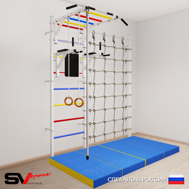 КОМПЛЕКТАЦИЯ: Шведская стенка Sv Sport усиленная (профиль вертикальных стоек 60 х 40 х 2 мм), Турник Sv Sport рукоход к ШС, Брусья Sv Sport к ШС, Kанат, Kольца деревянные, Спортивный мат 100 х 200 х 10 см складной, Канатный лаз.