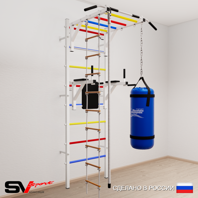 КОМПЛЕКТАЦИЯ: Шведская стенка Sv Sport усиленная (профиль вертикальных стоек 60 х 40 х 2 мм), Турник Sv Sport рукоход к ШС, Брусья Sv Sport к ШС, Kанат, Лестница веревочная, Цепь удлинитель 90см, Мешок боксерский 30кг.
