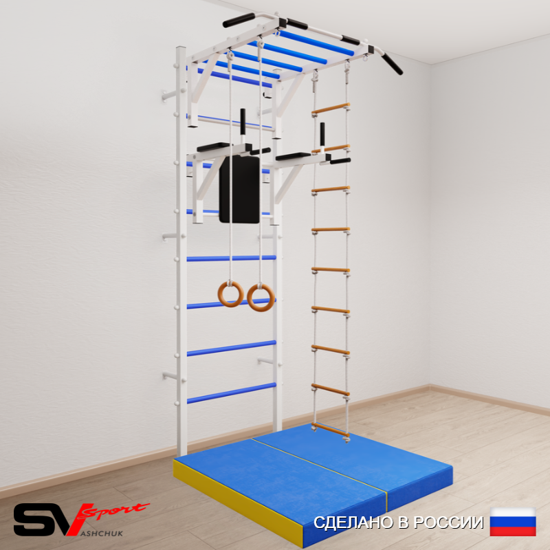 КОМПЛЕКТАЦИЯ: Шведская стенка Sv Sport усиленная (профиль вертикальных стоек 60 х 40 х 2 мм), Турник Sv Sport рукоход к ШС, Брусья Sv Sport к ШС, Kольца деревянные, Лестница веревочная, Спортивный мат 100 х 100 х 10 см складной.