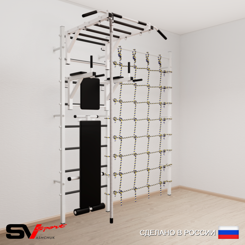 КОМПЛЕКТАЦИЯ: Шведская стенка Sv Sport усиленная (профиль вертикальных стоек 60 х 40 х 2 мм), Турник Sv Sport рукоход к ШС, Брусья Sv Sport к ШС, Скамья для пресса и жима Sv Sport к ШС, Kанат, Канатный лаз.