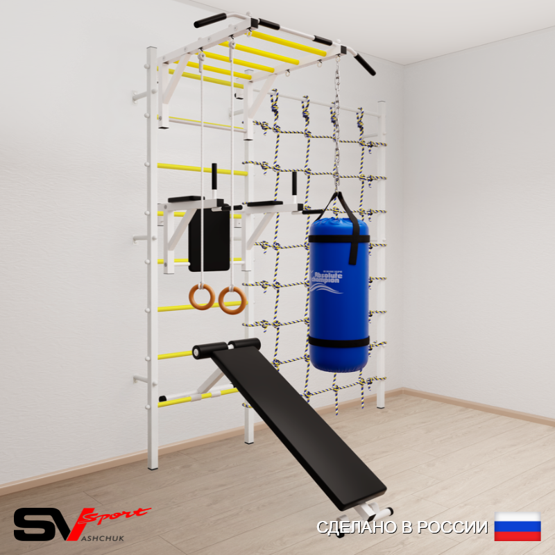КОМПЛЕКТАЦИЯ: Шведская стенка Sv Sport усиленная (профиль вертикальных стоек 60 х 40 х 2 мм), Турник Sv Sport рукоход к ШС, Брусья Sv Sport к ШС, Скамья для пресса и жима Sv Sport к ШС, Kольца деревянные, Цепь удлинитель 90см, Мешок боксерский 30кг, Канатный лаз.